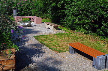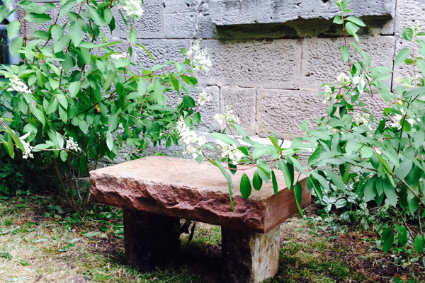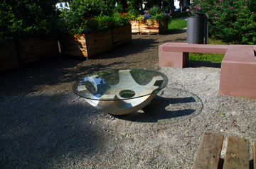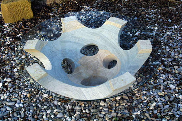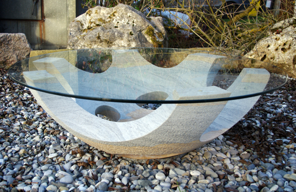 Der Tisch wurde aus einem ausgewählten Rohblock gefertigt. Die Besonderheit dieses Blockes war der Einschluss der blauen Blase (eine fossile Schlammeinlagerung). Die warme und kalte Farbigkeit des Materials korrespondiert mit der gestalteten Form. Die aufliegende Glasplatte den gestalterischen Austausch zur Geltung kommen.