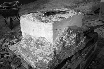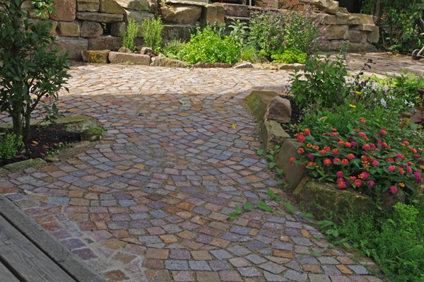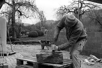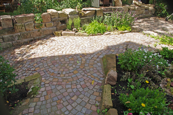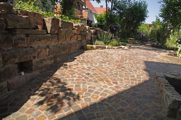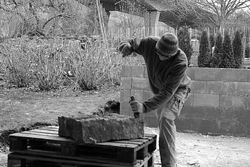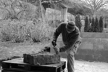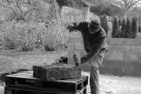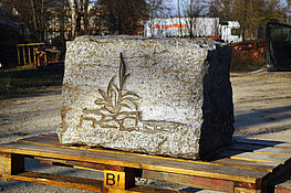 Für Hubert Neher Garten- und Landschaftsbau arbeitete Bildhauermeister Martin Hertfelder das Firmenlogo erhaben in einem Zierstein aus. Das Naturstein-Mauerwerk dient als vorgesetzte Beet und ziert das traditionelle Gabler-Gewächshaus.