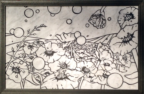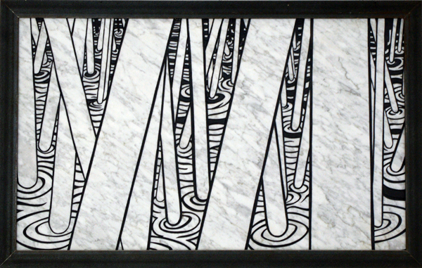 Mittels Sandstrahlverfahren wurden Tuschezeichnungen perspektivischer Darstellungen auf alten Marmortischplatten eingearbeitet. Ein auf die Größe der jeweiligen Platte angepasster Stahlrahmen dient nicht nur der Aufhängung. Die Kombination von Stahl und Naturstein lässt hier einen räumlichen Blick wie aus einem Fenster zu.